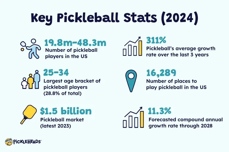 - Player growth: Pickleball has grown by 311% in the past three years, with over 19.8 million players in the U.S. alone.